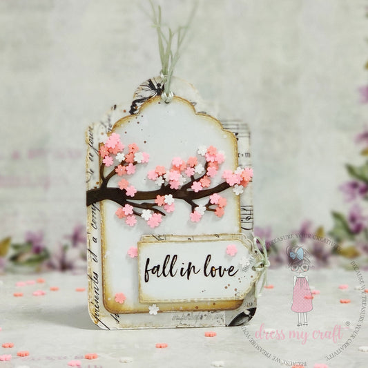 Delicately detailed and full of spring charm, this handmade card features blossoming cherry tree branches adorned with soft pink flowers, creating a stunning 3D effect. The warm brown background enhances the natural aesthetic, while a soft vellum strip across the center holds the sentiment: “Blossom with Love.” With dainty splatters and pastel tones, this card radiates warmth, new beginnings, and heartfelt emotion.