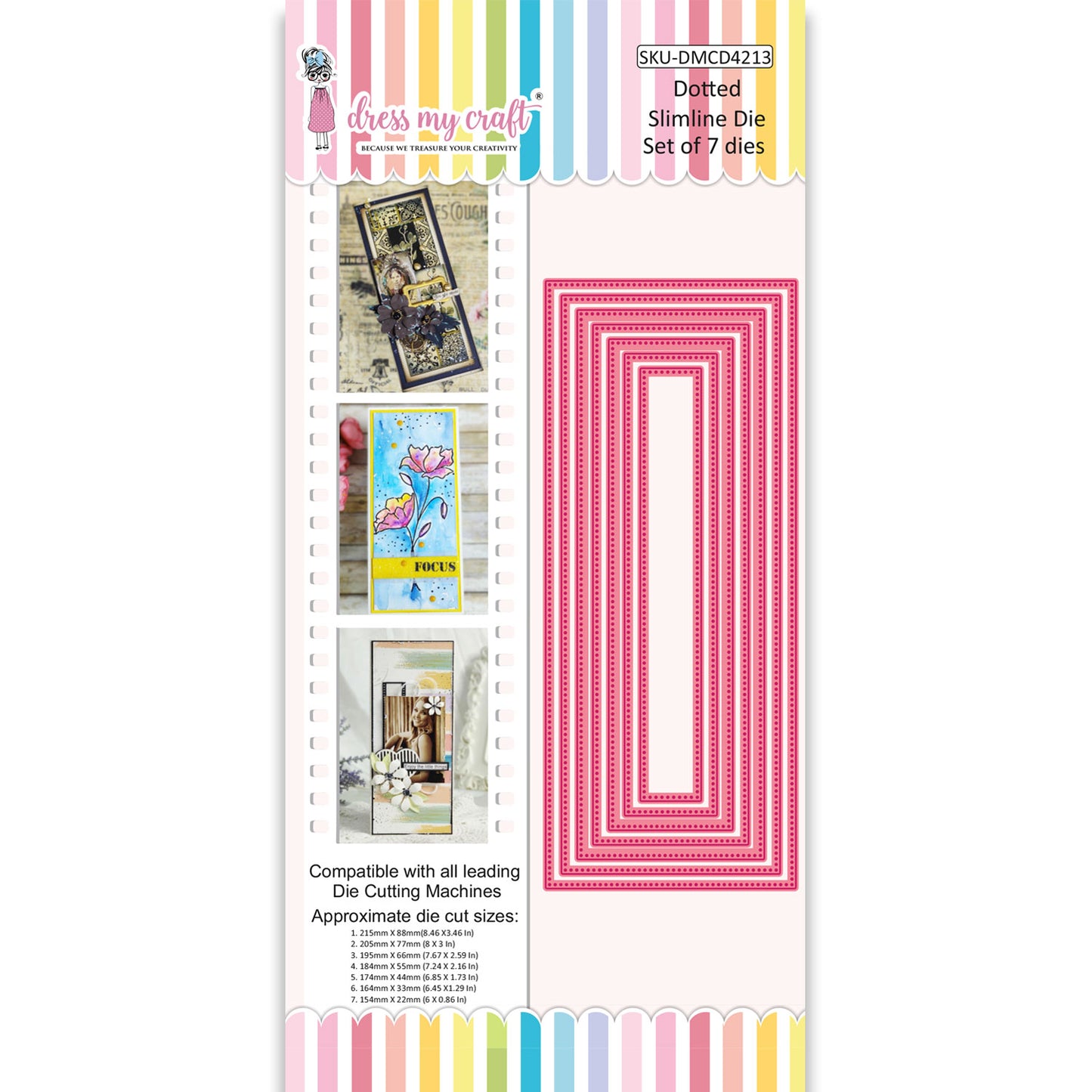 This die set contains Dotted Slimline Dies to make shaker tags, cards, scrapbooks, embellishments, window cards, frames, etc.